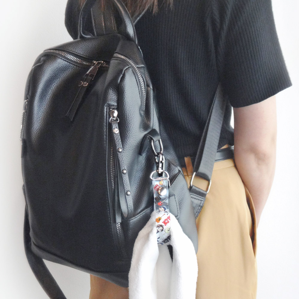 ホックで留め外しができるのでタオルを通すのも簡単! ベルト紐やカバン・リュックに付けておけば、タオルを下げていない時はキーホルダーとしての見た目もGOOD!