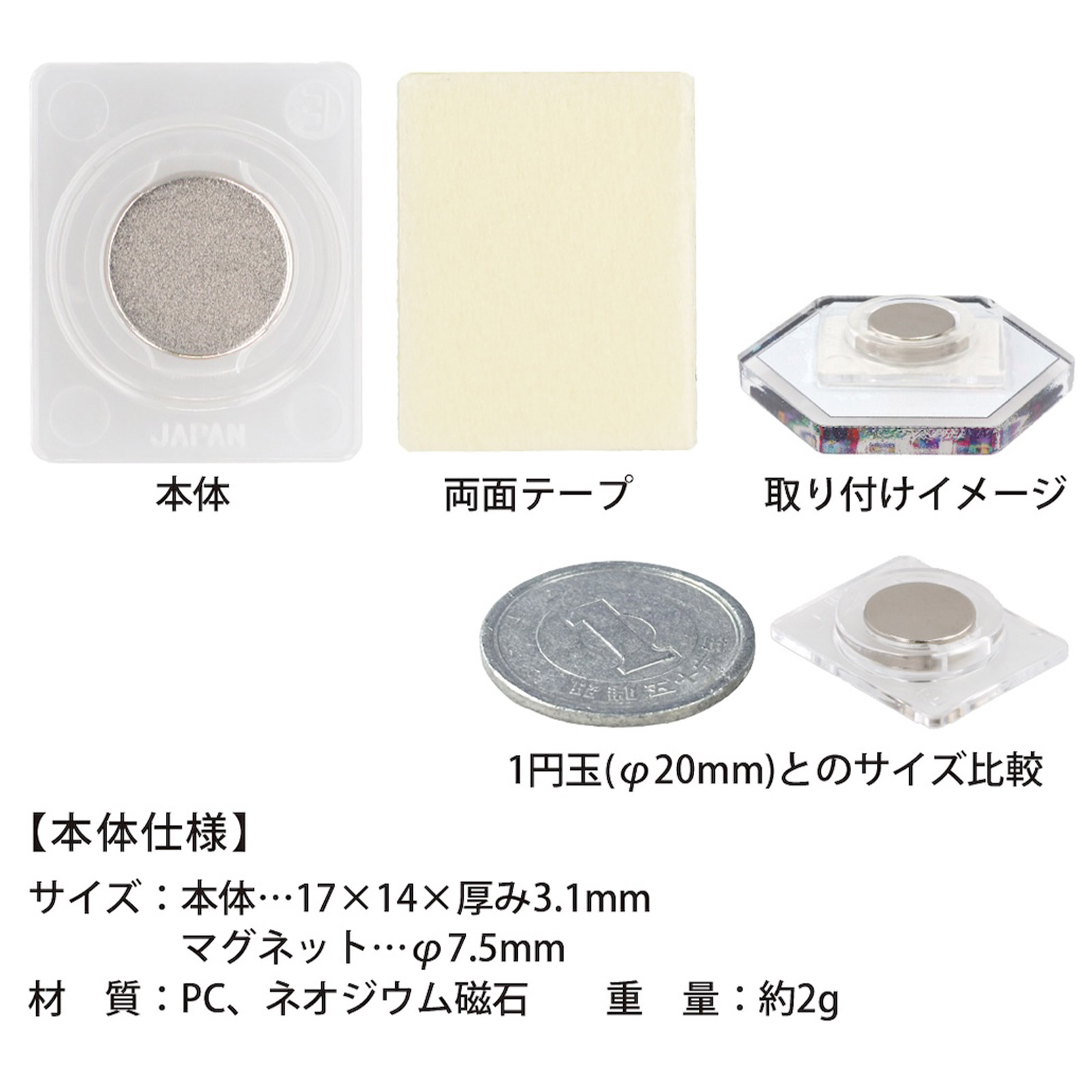 本体…17×14×厚み3.1mm マグネット…φ7.5mm