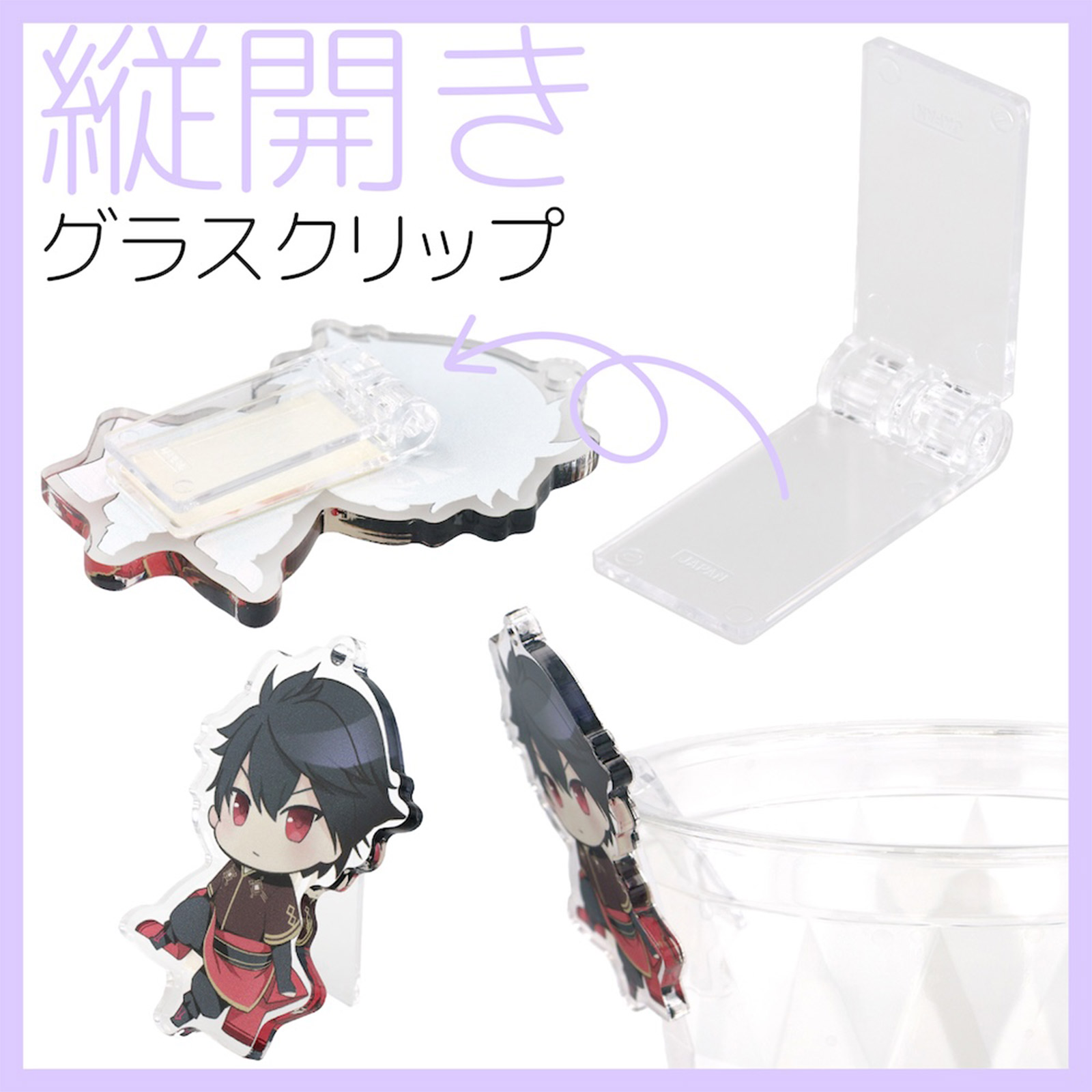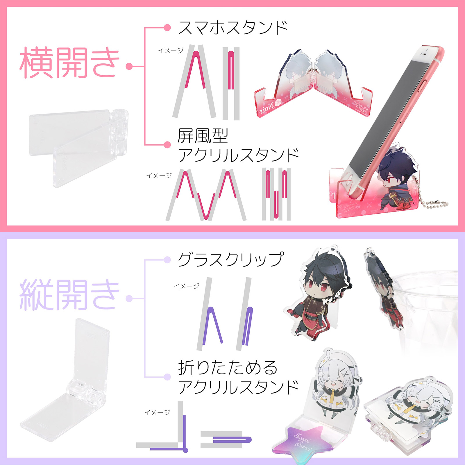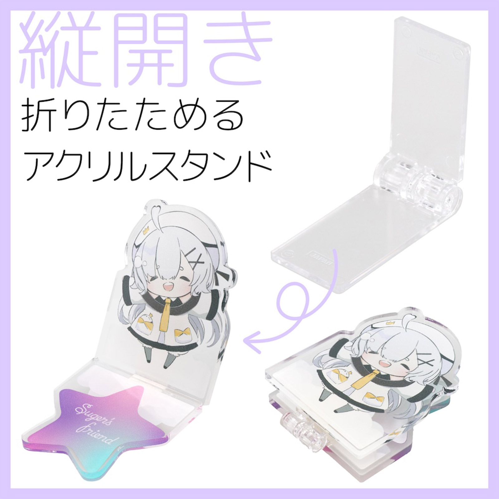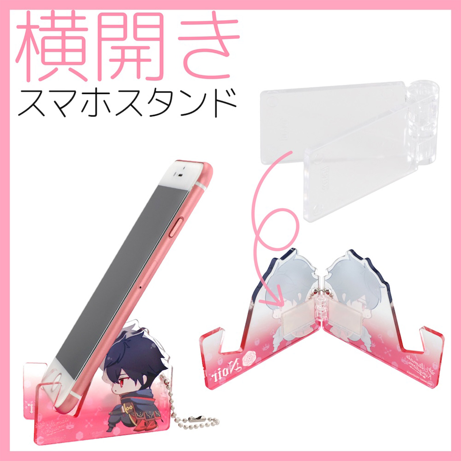 付属の両面テープで簡単に取り付けが可能で、スマホスタンドや 折りたためるアクリルスタンドなど工夫次第で機能性を付与することができます。