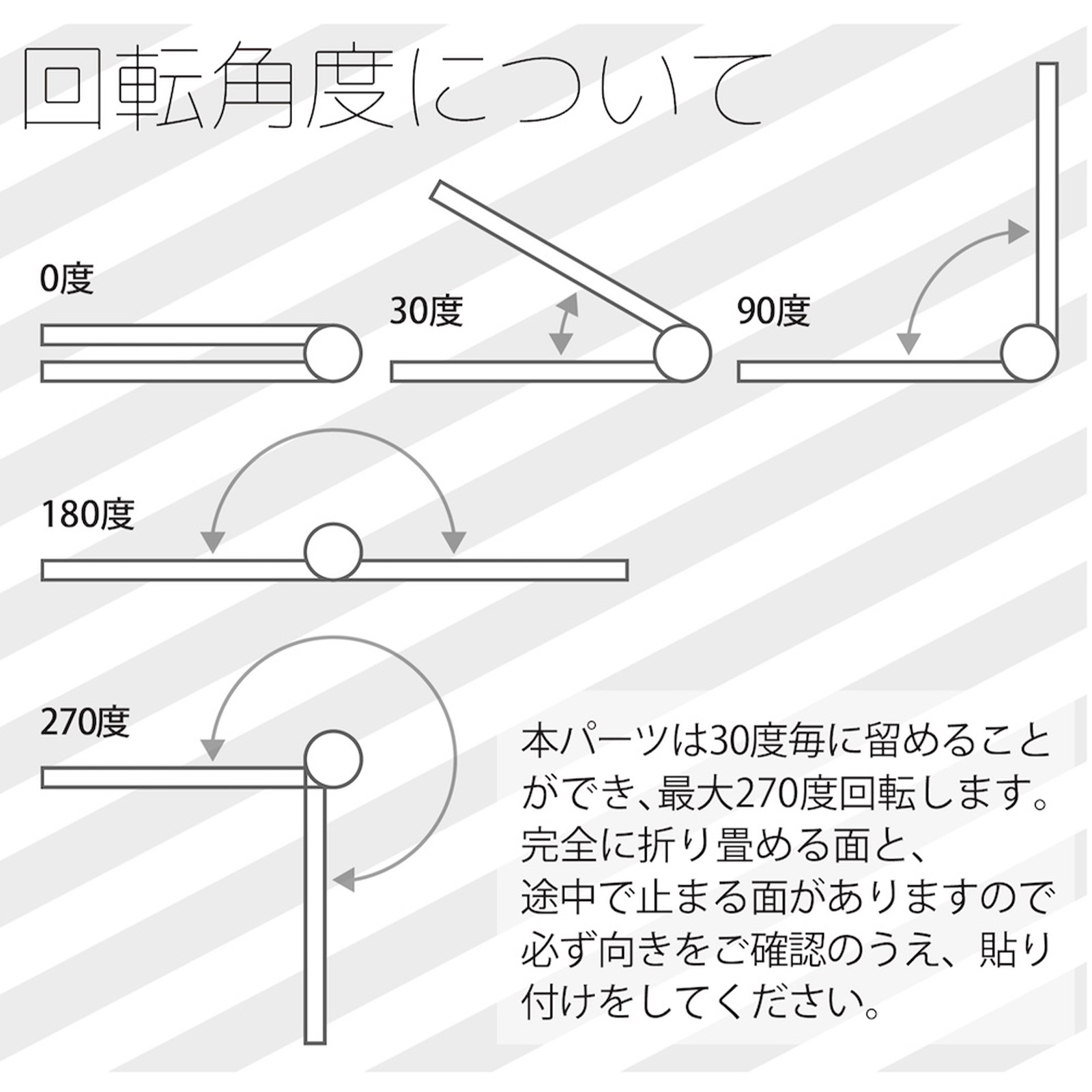 本パーツは30度毎に留めることができ、最大270度回転します。 完全に折り畳める面と、途中で止まる面がありますので必ず向きをご確認のうえ貼り付けてください。