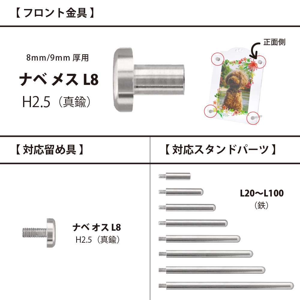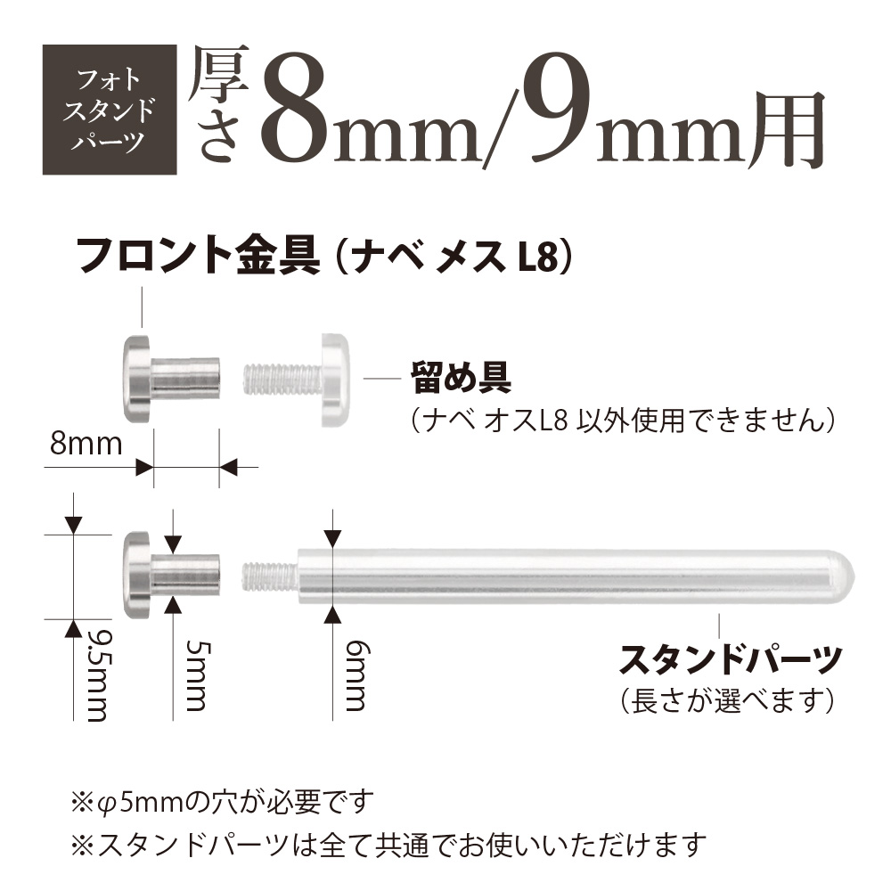 フォトスタンドパーツ フロント金具 8mm/9mm厚用 ナベメスL8 真鍮製 ニッケル