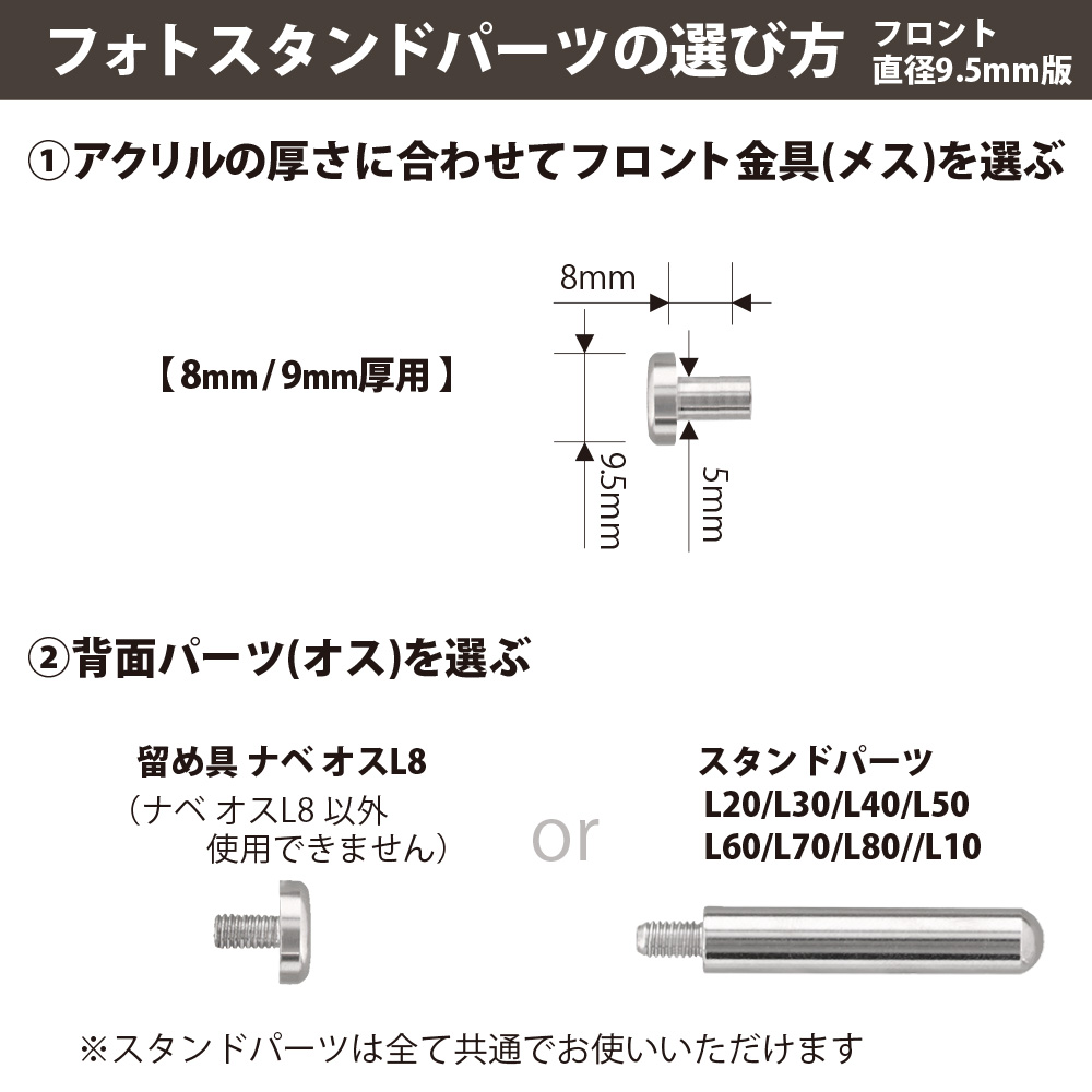 | サイズ | 直径φ9.5mm×長さ10.5mm 対応アクリル板:8mm厚 ※取付け部にはφ5mmの穴が必要です JIS規格M3.5、0.6ピッチのタップです。 |