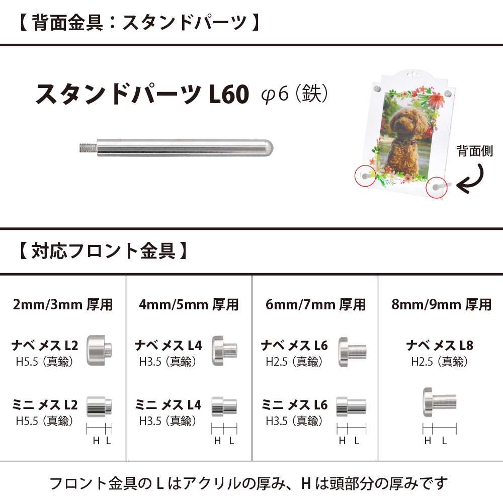 | サイズ | 直径φ6mm×長さ66mm 対応アクリル板:2~8mm厚 ※取付け部にはφ5mmの穴が必要です。 JIS規格M3.5、0.6ピッチのネジです。 |