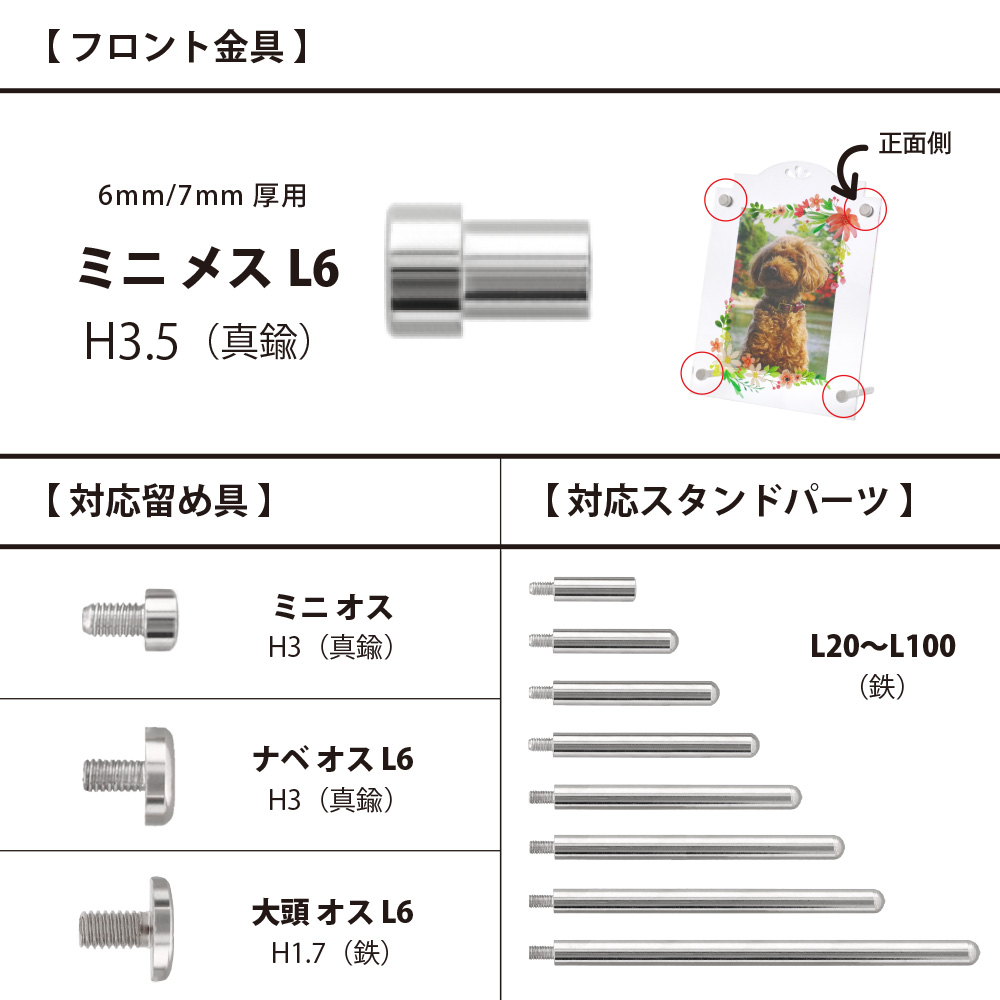 | サイズ | 直径φ6mm×長さ9.5mm 対応アクリル板:6mm厚 ※取付け部にはφ4.6mmの穴が必要です。 JIS規格M3.5、0.6ピッチのタップです。 |